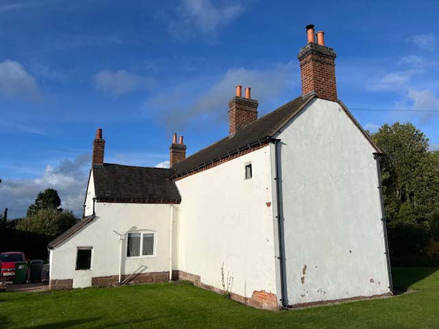 This project involved the complete removal of modern cement render from a historic mid-19th century brick property in Shropshire. The building had been coated in an impermeable render finish during previous repairs, which had begun to trap moisture within the masonry and contribute to damp conditions internally.