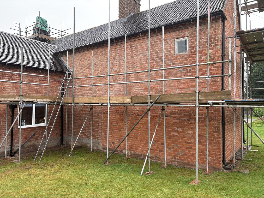 This project involved the complete removal of modern cement render from a historic mid-19th century brick property in Shropshire. The building had been coated in an impermeable render finish during previous repairs, which had begun to trap moisture within the masonry and contribute to damp conditions internally.